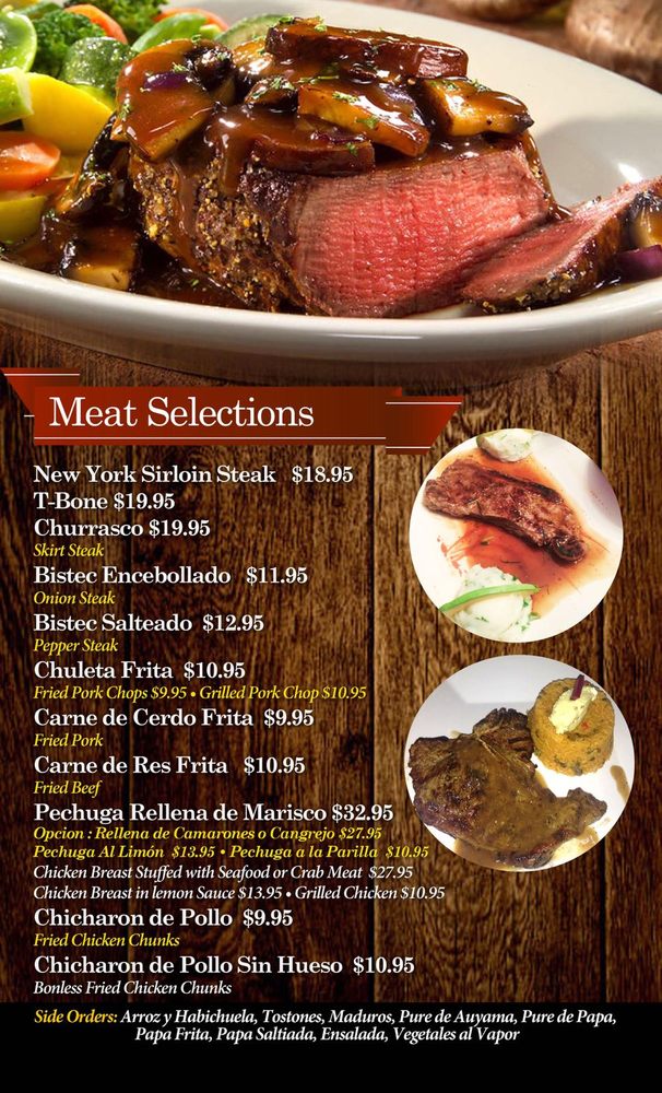 Pepper steak or salted chicken breast, rice medium beans, sweet plantains, and 2-liter soda. spring salad